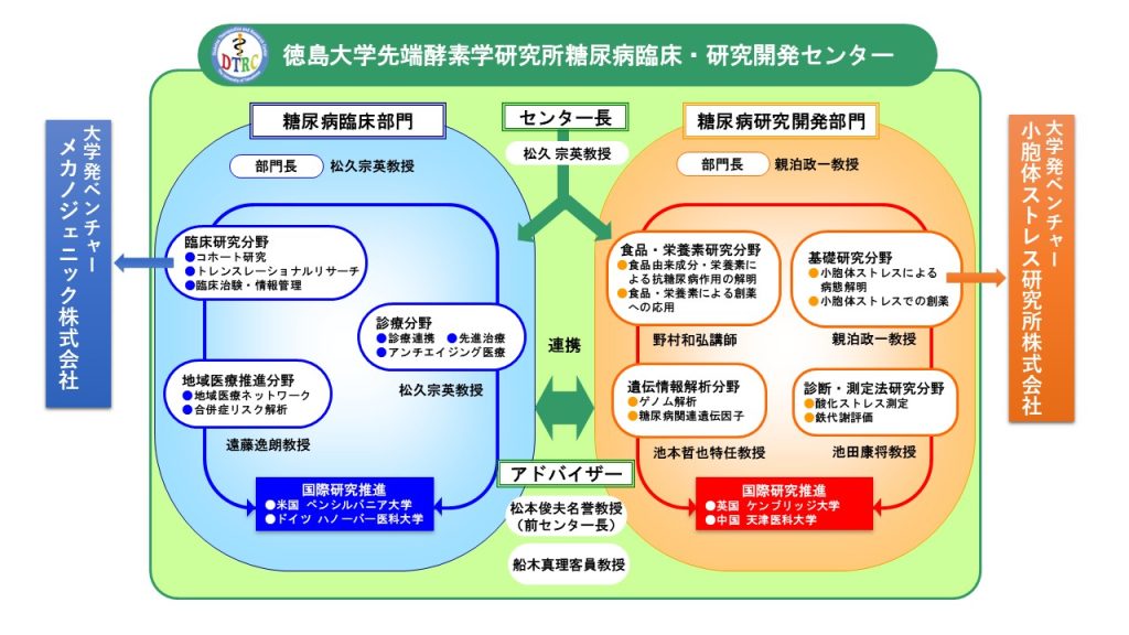世界的に重大な課題となっている糖尿病を克服することは、平成5年から長きにわたり糖尿病死亡率国内ワースト1であった徳島県にとっても最重要な課題である。このため、国内で類例のない戦略的な研究体制として、徳島大学に糖尿病臨床・研究開発センターが設立された。本センターは、「1.地域の医療をけん引する徳島大学病院での糖尿病診療を充実させ、県内各医療機関との医療連携を推進する、2.学内外とのグローバル連携および部局横断連携に基づく先進的な糖尿病研究開発を行う、3.卓越した基礎研究成果を臨床へつなげるトランスレーショナルリサーチの展開と臨床試験の推進を行う、4.産学官連携推進を支援する知財活動を行う、5.実際の医療の現場で先進的医療を行う糖尿病関連医療人の人材育成を行う」ことを目標とする。
