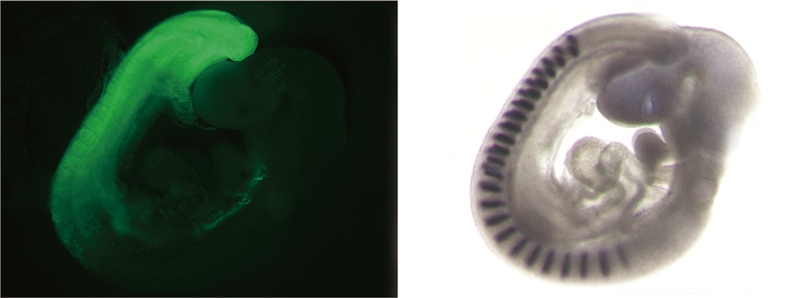図は、将来の体幹部・尾部の胚組織で蛍光タンパクを発現する遺伝子改変マウス。私たちは、体軸幹細胞の制御に関与する遺伝子の機能を欠失させることや、体軸幹細胞から産み出される細胞系列を標識することで解析を進めています。